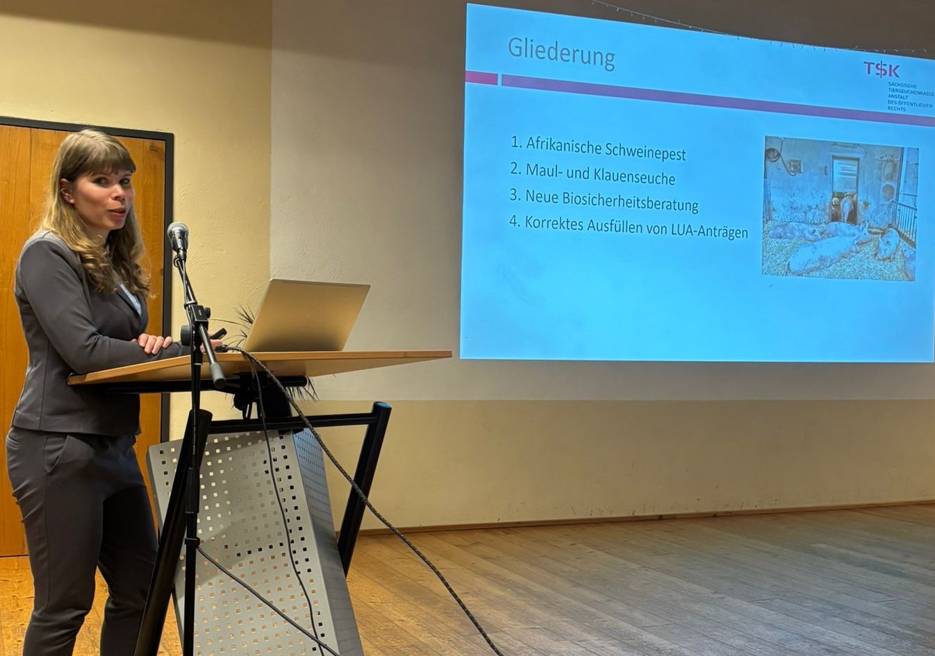 Als letzte Rednerin des Abends informierte Dr. Catherine Herlt, Schweinegesundheitsdienst der Sächsischen Tierseuchenkasse, die Anwesenden über die aktuelle Tierseuchenlage hinsichtlich Afrikanischer Schweinepest und Maul- und Klauenseuche. Des Weiteren stellte Sie die neue umfängliche Biosicherheitsberatung der Tierseuchenkasse vor.
