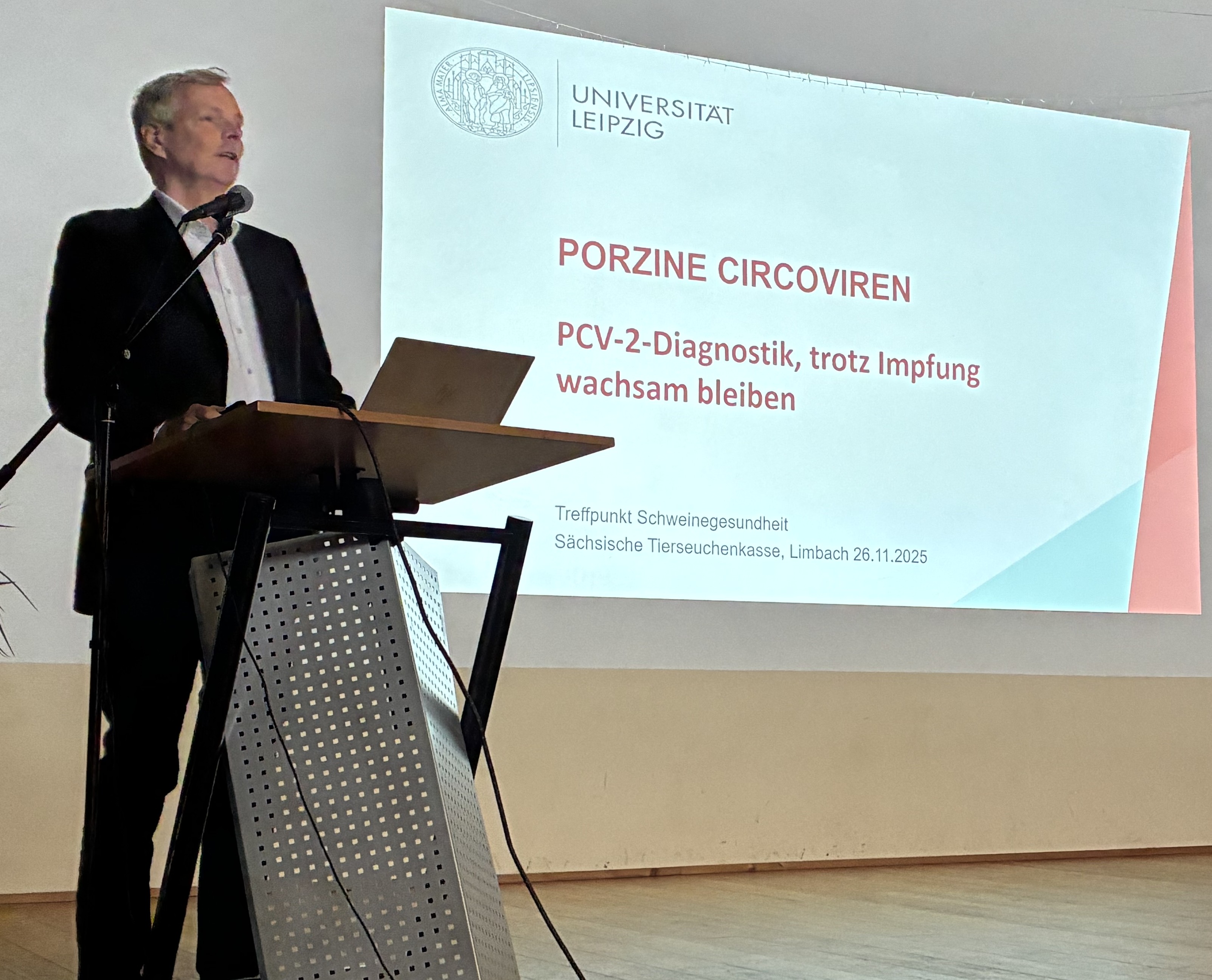 Im dritten Vortrag stellte Prof. Dr. Thomas Vahlenkamp, Leiter des Institutes für Virologie und Dekan der Veterinärmedizinischen Fakultät der Universität Leipzig, neue Erkenntnisse zu PCV-2 und PCV-3 vor. Er betonte, dass trotz einer PCV-2-Impfung PCV-assoziierte Erkrankungen auftreten können und ging auf die Wichtigkeit der diagnostischen Trias ein.