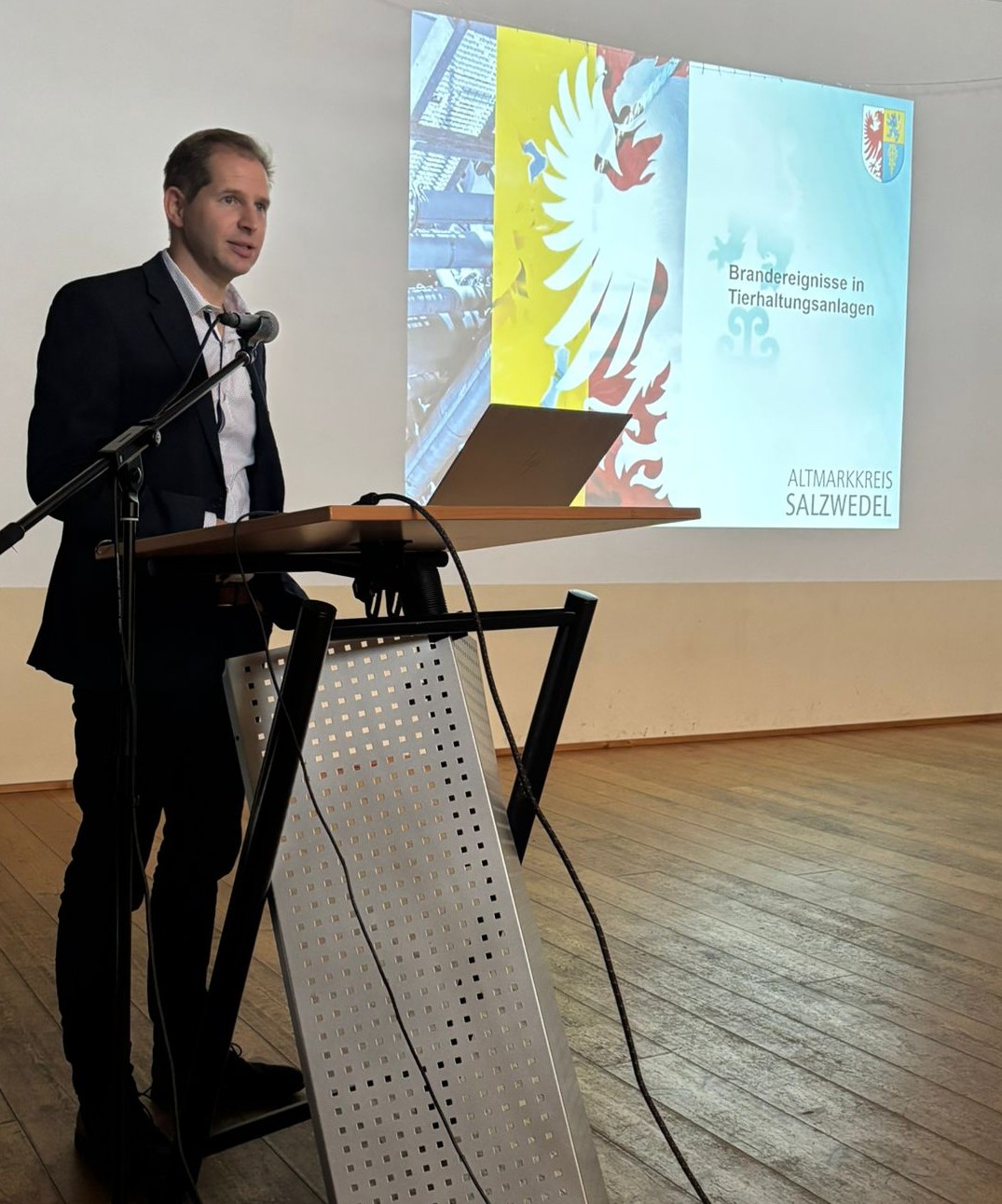 Herr Ramón Rulff, Leiter des Amtes für Verbraucherschutz und Gesundheit im Altmarkkreis Salzwedel und Ortswehrleiter der Feuerwehr in Kalbe, sprach im zweiten Vortrag über die schnelle Ausbreitung eines Stallbrandes. Er empfahl den Tierhaltern sich mit der örtlichen Feuerwehr in Verbindung zu setzen, um solch ein Szenario vorher zu besprechen und im Ernstfall besser handeln zu können.